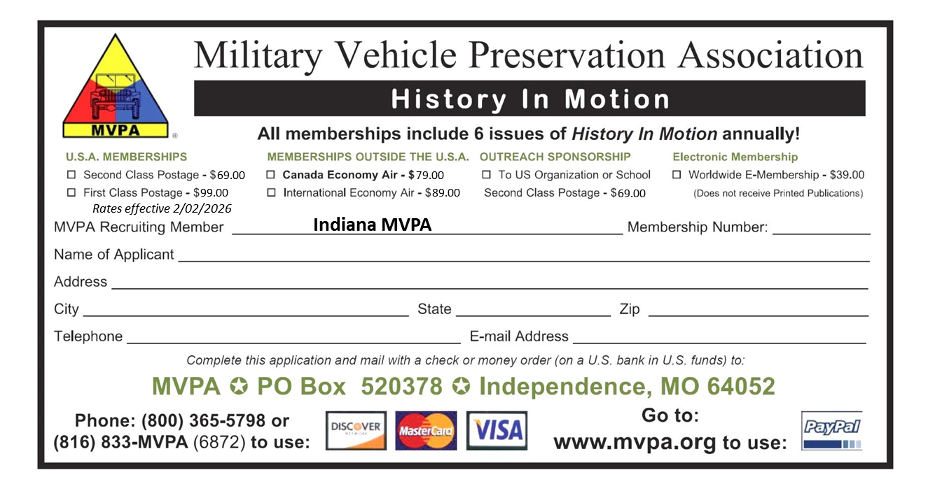Indiana affiliate of the MVPA? Download an application and mail it in or bring it to our next meeting. No military vehicle required.